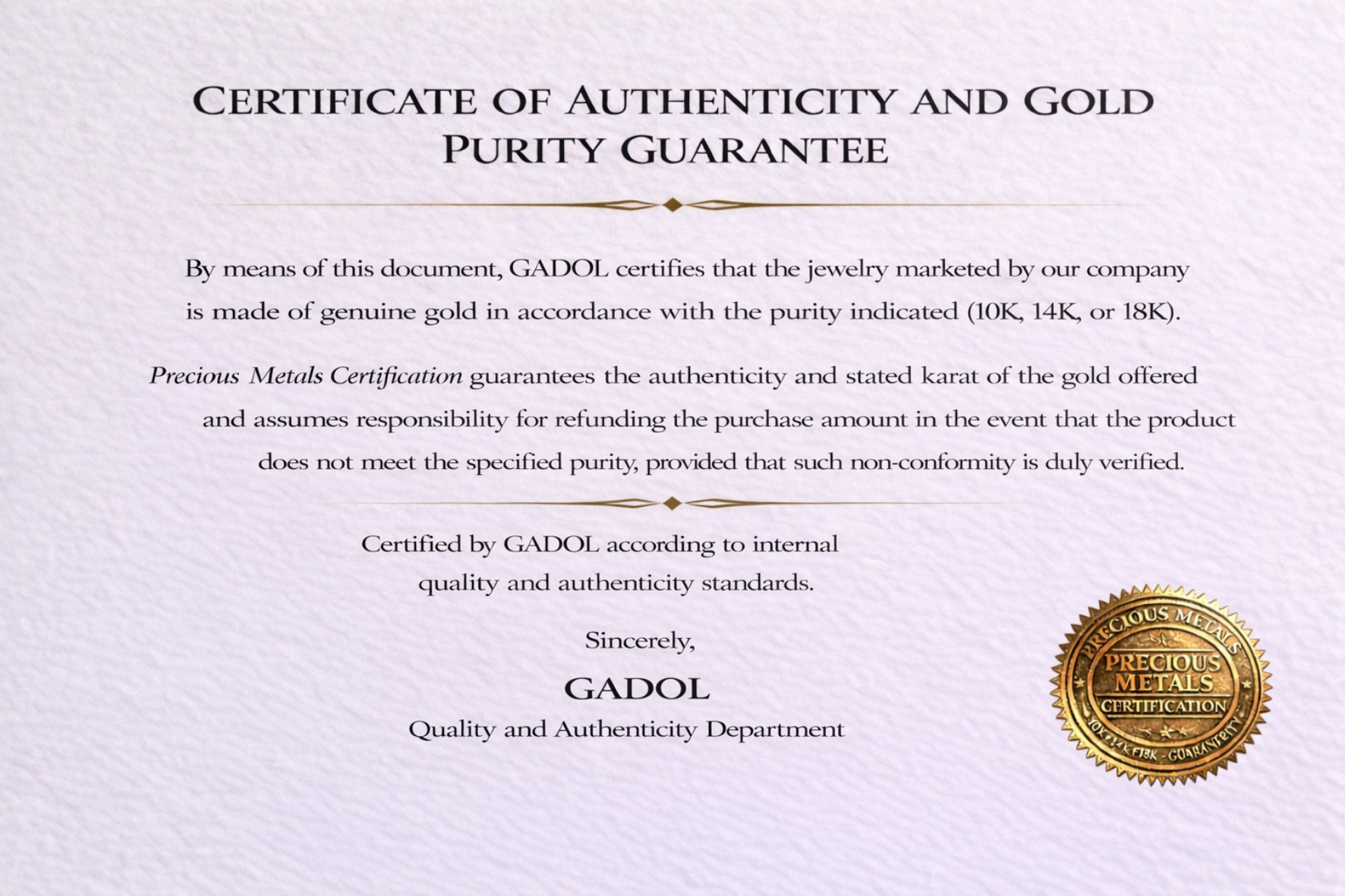 Every piece is made with genuine gold and carefully inspected before shipping to ensure it meets our quality standards.
