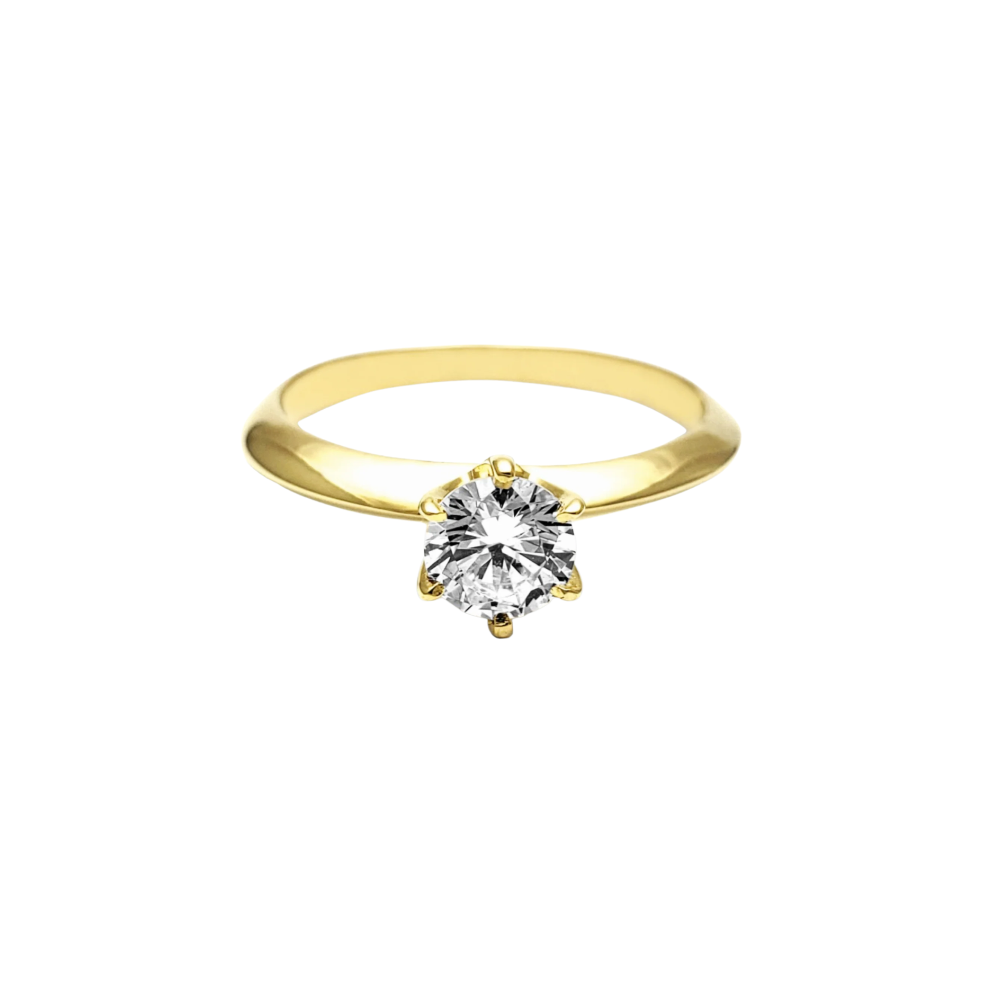 - Design: Classic solitaire setting with a smooth, polished band and prong-set zirconia centerpiece.